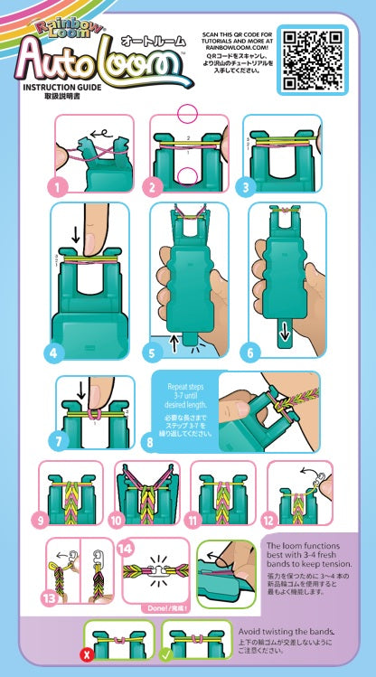「Auto Loom® (オートルーム)」は、3年間あまりかけて開発された半自動的な編み機で、とても楽しく素早くブレスレットが制作できるキットです。「Auto Loom® (オートルーム)」のピンに輪ゴムをかけ、カチッとレバーを押し上げれば自動的に輪ゴムを編み上げてくれます。子どもは勿論、大人たちも夢中にカチカチっと楽しく編み続けていきます。